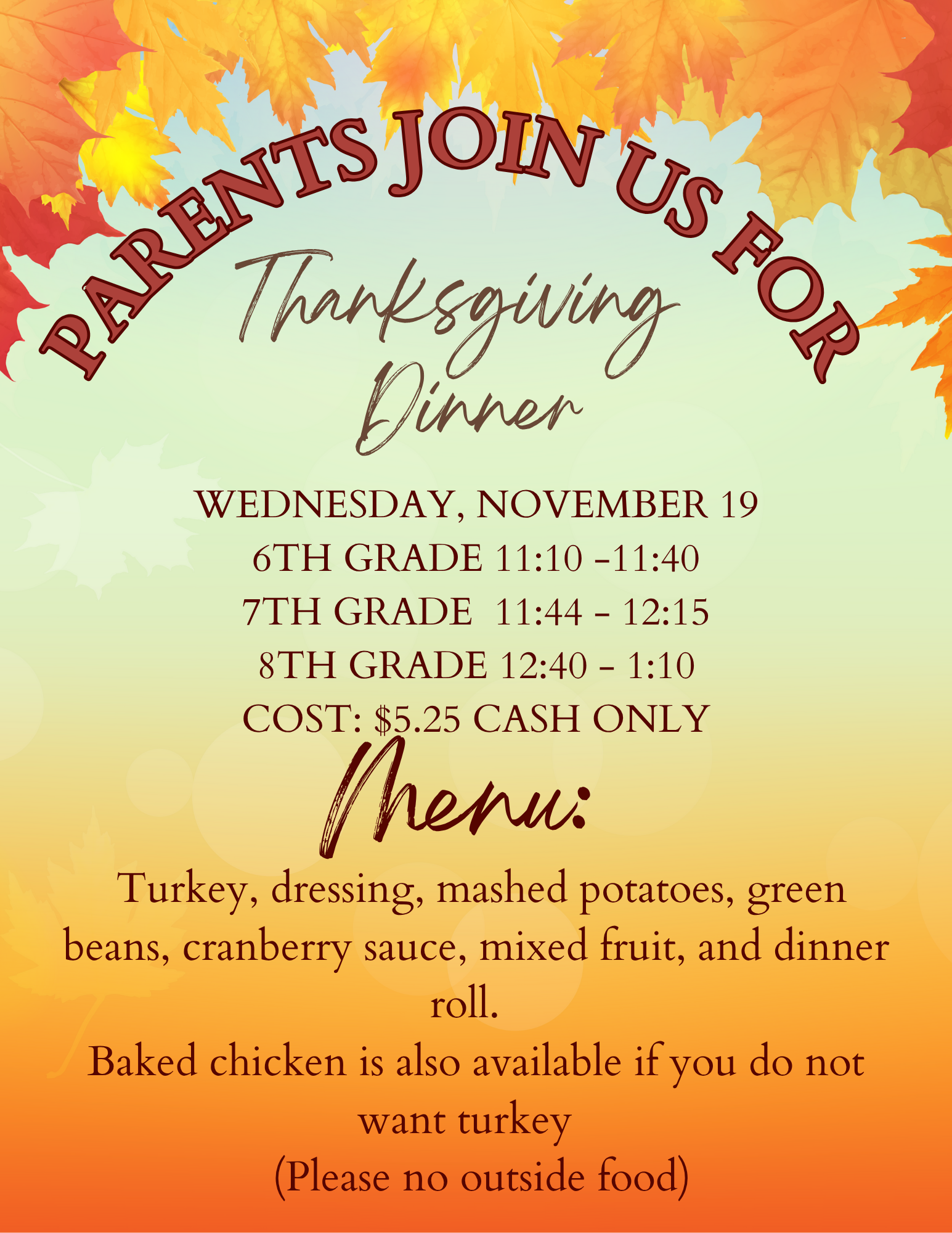 WOSMS is excited to invite families to join us for our campus Thanksgiving Dinner on Wednesday, November 19! Parents and guardians are welcome to come enjoy a holiday meal with their student during their scheduled lunchtime.