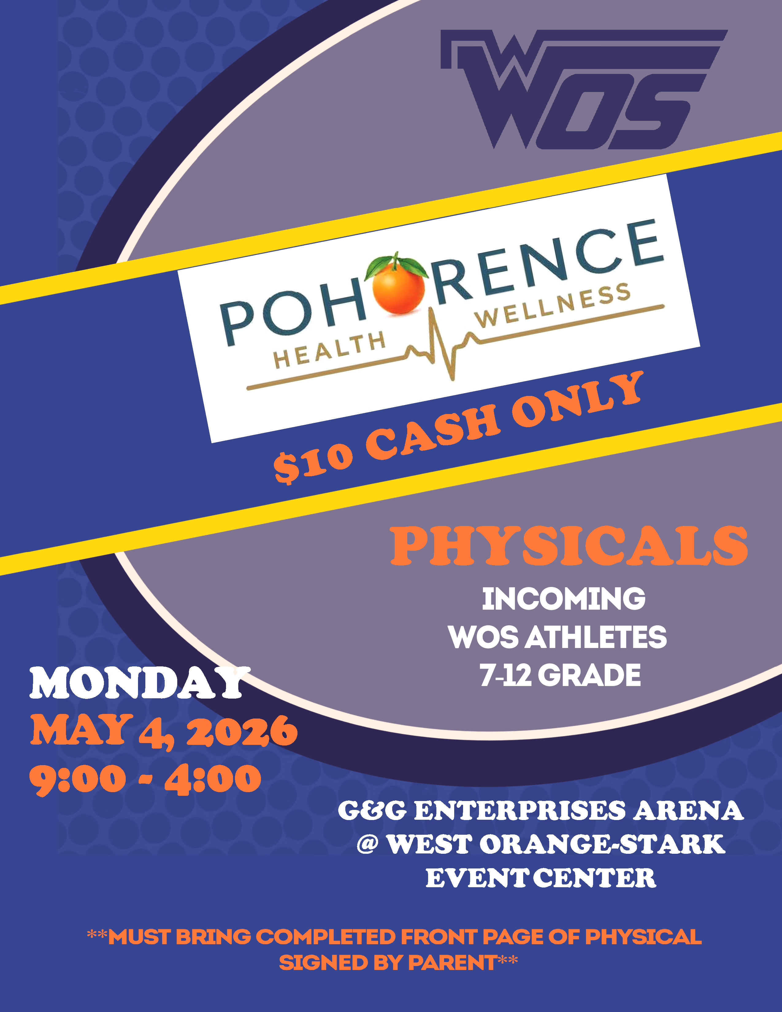 Athletics Physicals, Monday, May 4th Physicals for WOS athletes will be held on Monday, May 4th, from 9 a.m. to 4 p.m. at the WOSHS G&G Enterprises Arena & Event Center. Bring $10 (cash only) & the front page of the physical paperwork with parent's signature. Print